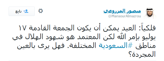 وأوضح بأن هلال شهر شوال يُولد بعد الاقتران بحدود الساعة ٤:٢٤ فجر الخميس ٢٩ رمضان بتوقيت مكة المكرمة، ويبقى بسماء مكة بعد غروب شمس الخميس حتى ١٠-١٢ دقيقة